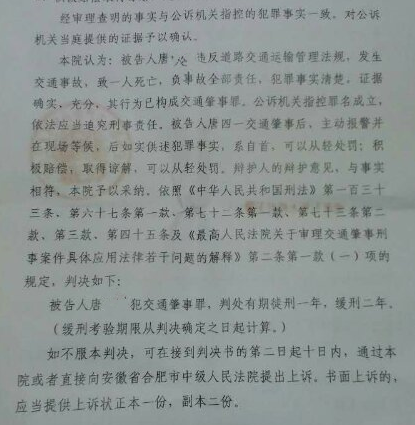 近日,安徽金亞太律師事務(wù)所蘇義飛律師代理的一起交通肇事罪案件迎來(lái)一審判決。在蘇律師的全力辯護(hù)下,被告人唐某某雖因交通肇事致一人死亡,但因具備自首、積極賠償并取得諒解等從寬情節(jié),最終被法院依法判處緩刑,得以回歸家庭、回歸社會(huì)。