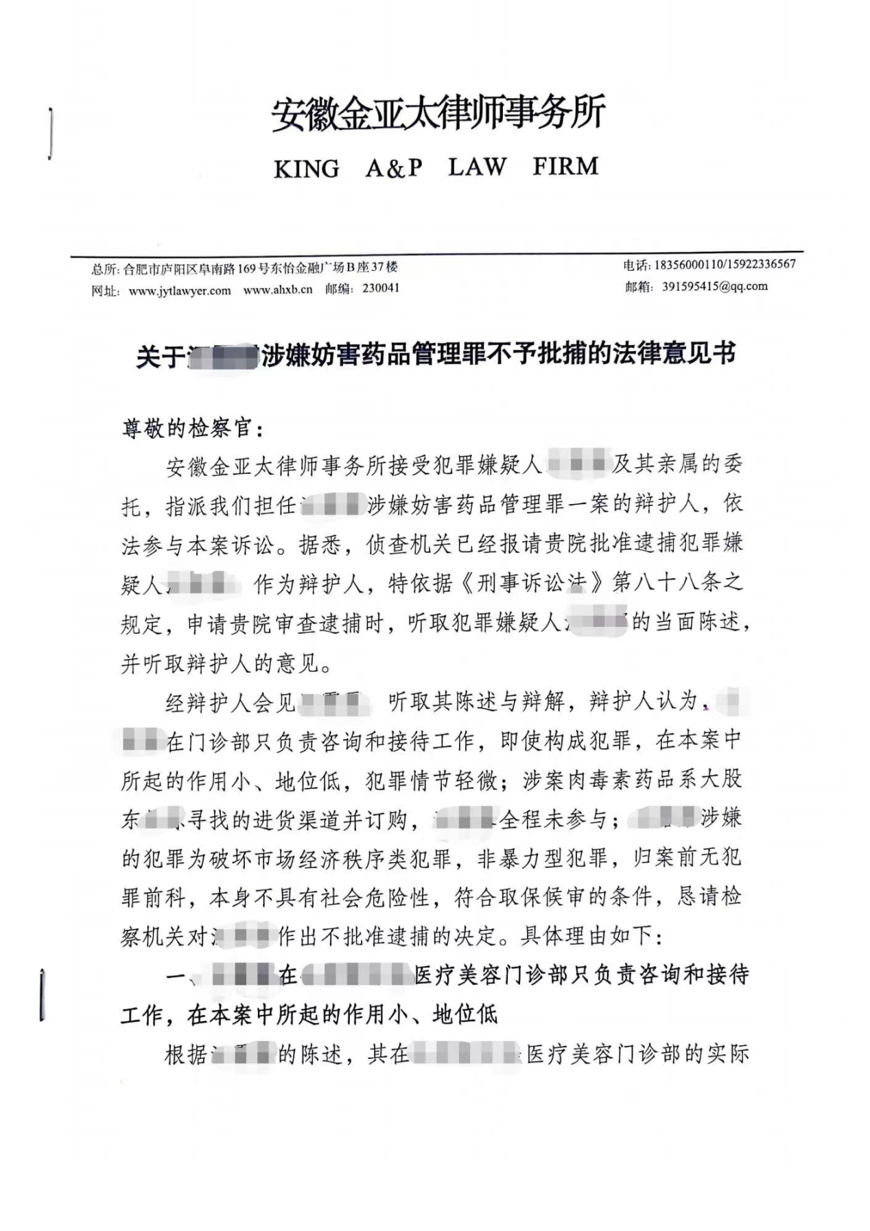 2.2023年3月27日,承辦律師與檢察官取得聯(lián)系,溝通案情,向檢察官提交了不予批捕的法律意見書,提出汪某某在該醫(yī)療美容門診部只負(fù)責(zé)咨詢和接待工作,所起的作用小、地位低;涉案肉毒素藥品系大股東尋找的進(jìn)貨渠道并訂購,汪某某全程未參與;汪某某涉嫌的犯罪非暴力型犯罪,歸案前無犯罪前科,本身不具有社會危險性,不具有逮捕的必要性,并且汪某某家中兩個年幼的孩子需要母親照料等意見。檢察官根據(jù)承辦律師提出的法律意見,前往H市看守所提審?fù)裟衬?,核?shí)案件情況。