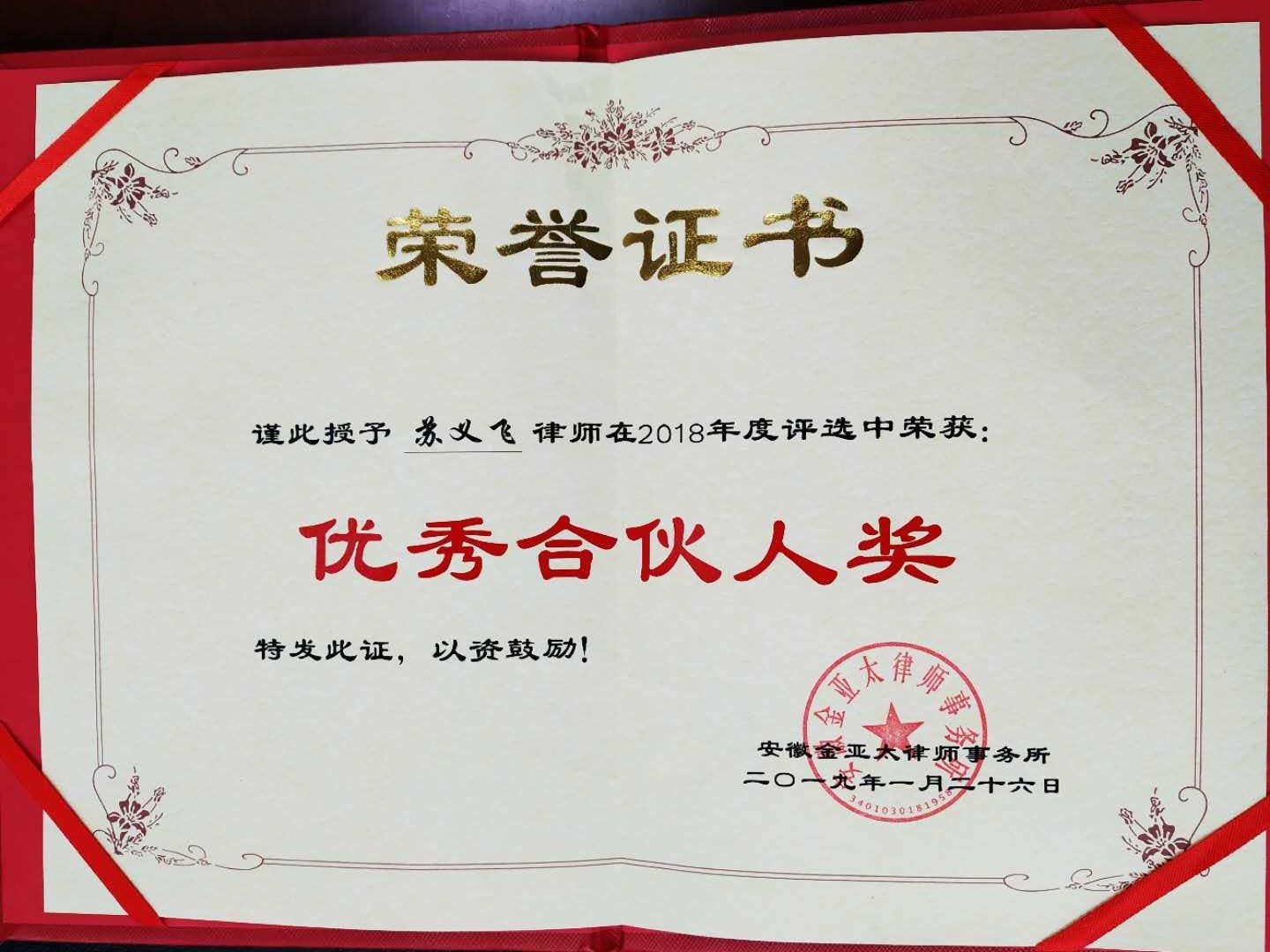 2019年1月26日,第26屆安徽金亞太律師事務(wù)所年會成功舉辦,經(jīng)過113名律師投票選舉,安徽金亞太律師事務(wù)所高級合伙人蘇義飛律師榮獲2018年度優(yōu)秀合伙人稱號。