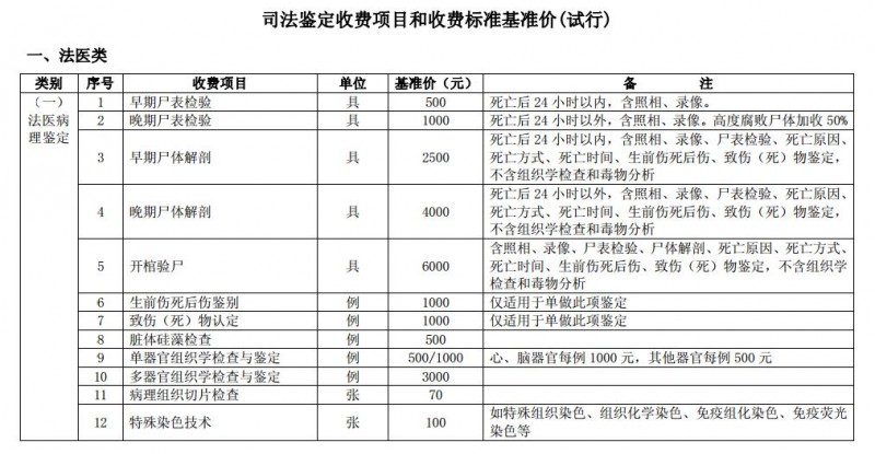 在《司法鑒定收費項目和收費標準基準價(試行)》以外,新增的法醫(yī)、物證、聲像資料類司法鑒定收費項目和收費標準,由省級價格主管部門會同同級司法行政部門制定;國務院價格主管部門會同同級司法行政部門根據(jù)各地新增收費項目和收費標準的情況,適時制定全國統(tǒng)一的司法鑒定收費項目和收費標準基準價。