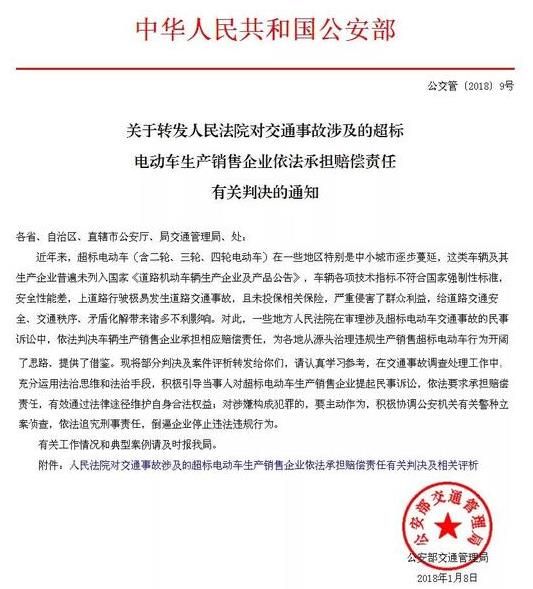 公安部關(guān)于轉(zhuǎn)發(fā)人民法院對交通事故涉及超標(biāo)電動車生產(chǎn)銷售企業(yè)依法承擔(dān)賠償責(zé)任有關(guān)判決的通知