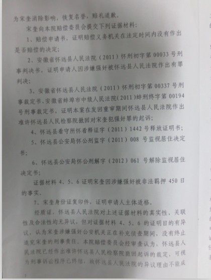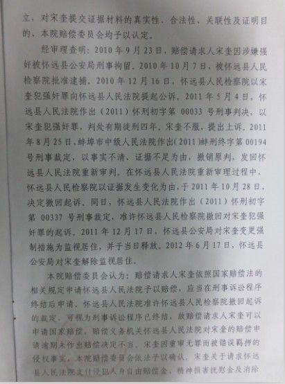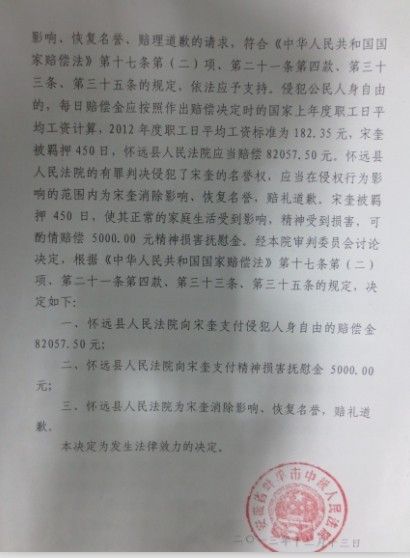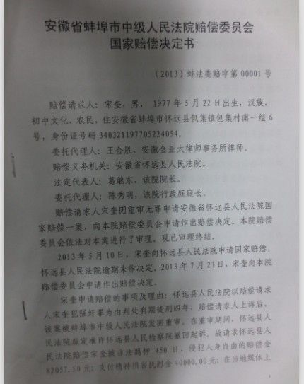 【按語】2010年9月21日晚22時許,家住懷遠縣206國道邊漁場內(nèi)的女孩包某在熟睡中被人強奸。案發(fā)后宋奎被指認存在重大嫌疑,于同年9月23日被懷遠縣公安局刑事拘留。宋奎到案后,拒不認罪,稱當(dāng)晚下著大雨,自己在家睡覺,根本沒有外出,無作案時間。懷遠縣人民法院于2011年5月4日以強奸罪,判處宋奎有期徒刑四年。宋奎不服,提出上訴。蚌埠市中級人民法院以事實不清,證據(jù)不足為由撤銷原判,發(fā)回懷遠縣人民法院重新審判。在懷遠縣人民法院重新審理過程中,懷遠縣人民檢察院以證據(jù)發(fā)生變化為由,于2011年10月28日決定撤回起訴。同年12月17日宋奎被羈押450天后被釋放。但一年多過去了,檢察院沒有重新起訴,宋奎向懷遠縣法院申請國家賠償,被告知訴訟程序尚未終結(jié),檢察院可能會重新起訴為由,進行百般刁難,不予受理。而蚌埠中院也以案件沒經(jīng)過賠償義務(wù)機關(guān)處理為由不予受理。2013年4月20日,宋奎夫婦二人來到合肥,委托王金勝律師親自代理此案,代為向懷遠縣人民法院提出國家賠償。2013年5月10日懷遠縣法院受理了該案,但在法定期限內(nèi)未作出是否賠償?shù)臎Q定。同年7月17日,王金勝律師依法向蚌埠中院申請國家賠償。2013年12月13日,蚌埠市中級人民法院作出賠償決定書,責(zé)令懷遠縣人民法院賠償宋奎被羈押450天的各項經(jīng)濟損失共計87057.50元,并為宋奎消除影響,恢復(fù)名譽,賠禮道歉。2014年春節(jié)過后,拿到國家賠償款的宋奎夫婦制作了一面錦旗,專程趕到合肥,送給了王金勝律師,以示感謝。 中國新聞網(wǎng)、人民網(wǎng)、中國日報網(wǎng)、中國江蘇網(wǎng)、中安在線、安徽商報等多家媒體對該案進行了報道。